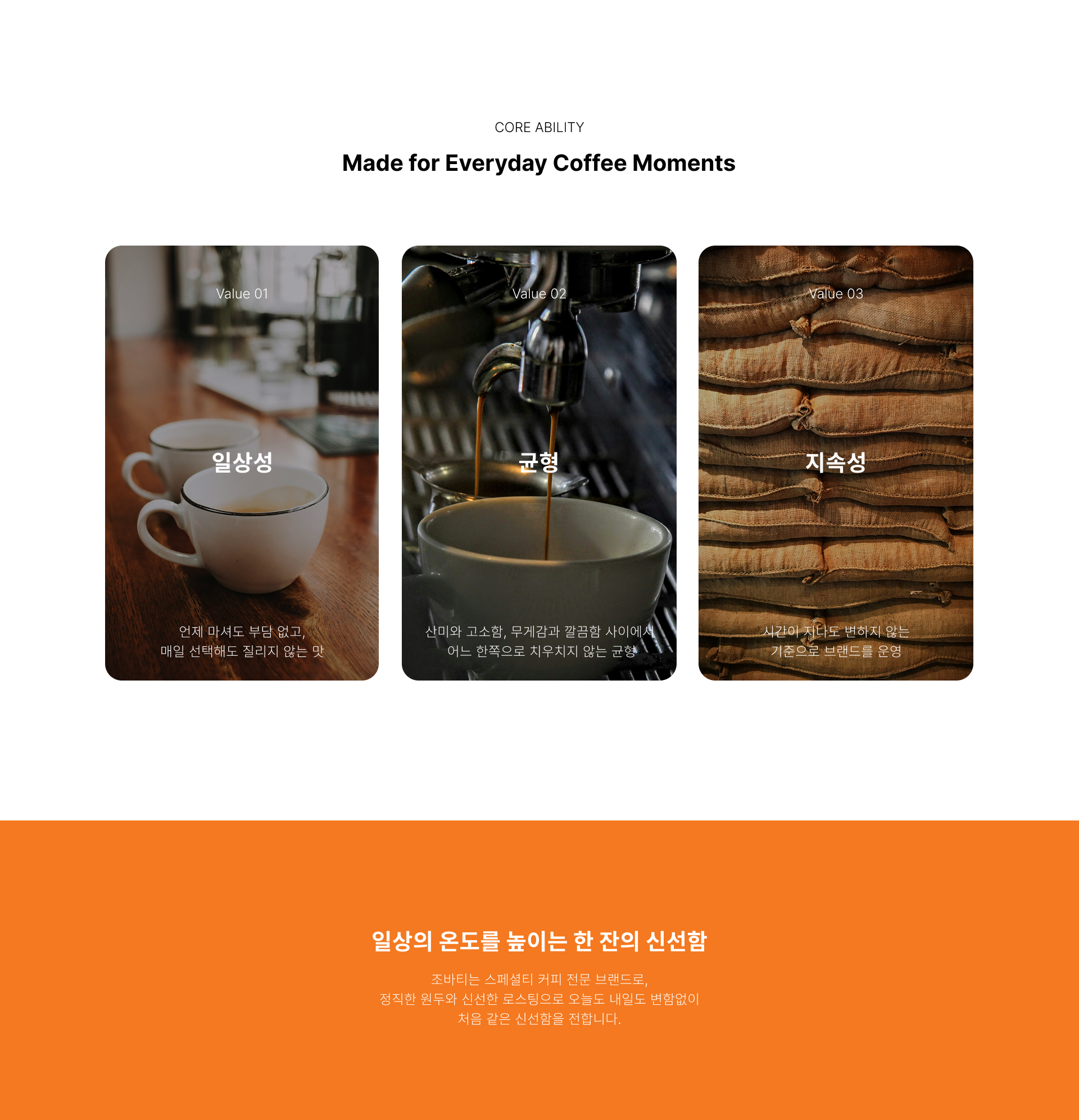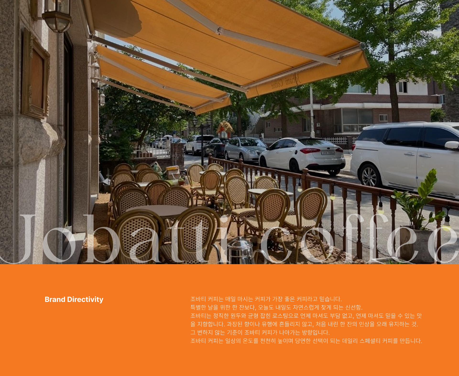 조바티 커피는 일산에서 사랑받는 3대 커피 브랜드로 한 번의 감동보다 매일의 신뢰가 더 오래 남는다고 믿는 브랜드입니다. 유행보다 일상에, 화려함보다 균형에 집중하며 자주 마셔도 부담 없고, 계속 찾게 되는 커피를 목표로 브랜딩을 시작했습니다.이 프로젝트는 ‘좋은 커피란 무엇인가’보다 ‘사람들은 어떤 커피와 가장 오래 함께하는가’라는 질문에서 출발했습니다. 조바티커피는 일상의 리듬에 맞는 맛과 톤을 기준으로, 브랜드 경험 전반을 하나의 흐름으로 정리한 데일리 커피 브랜드입니다.